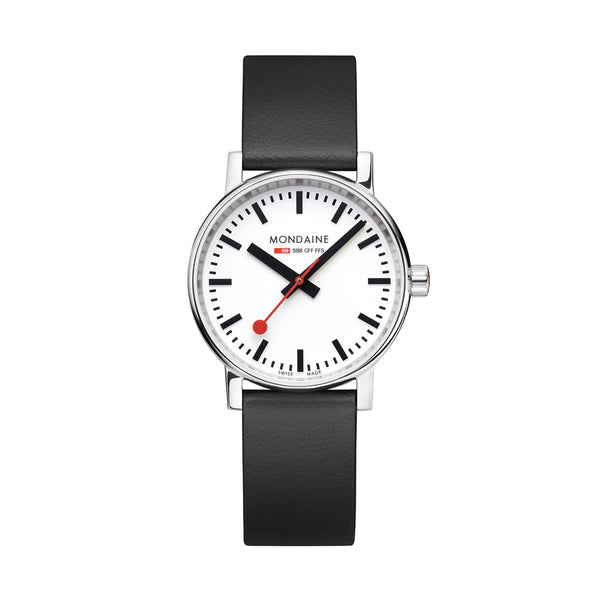 Edelstahlgehäuse 36mmgehärtetes MineralglasQuarzwerkveganes Band Das vegane Traubenlederarmband in schwarz mit rotem Innenfutter besteht zu 75 % aus pflanzlichem Öko-Verbundstoff und zu 25 % aus recyceltem PET-Material.